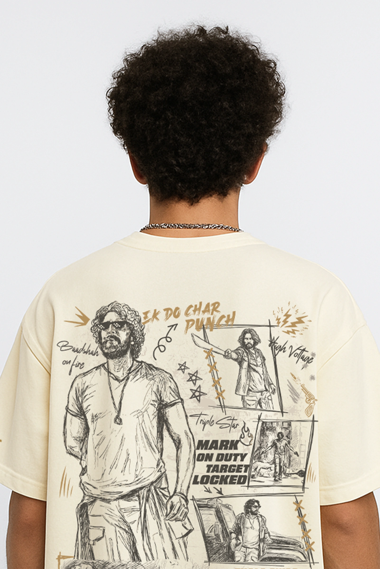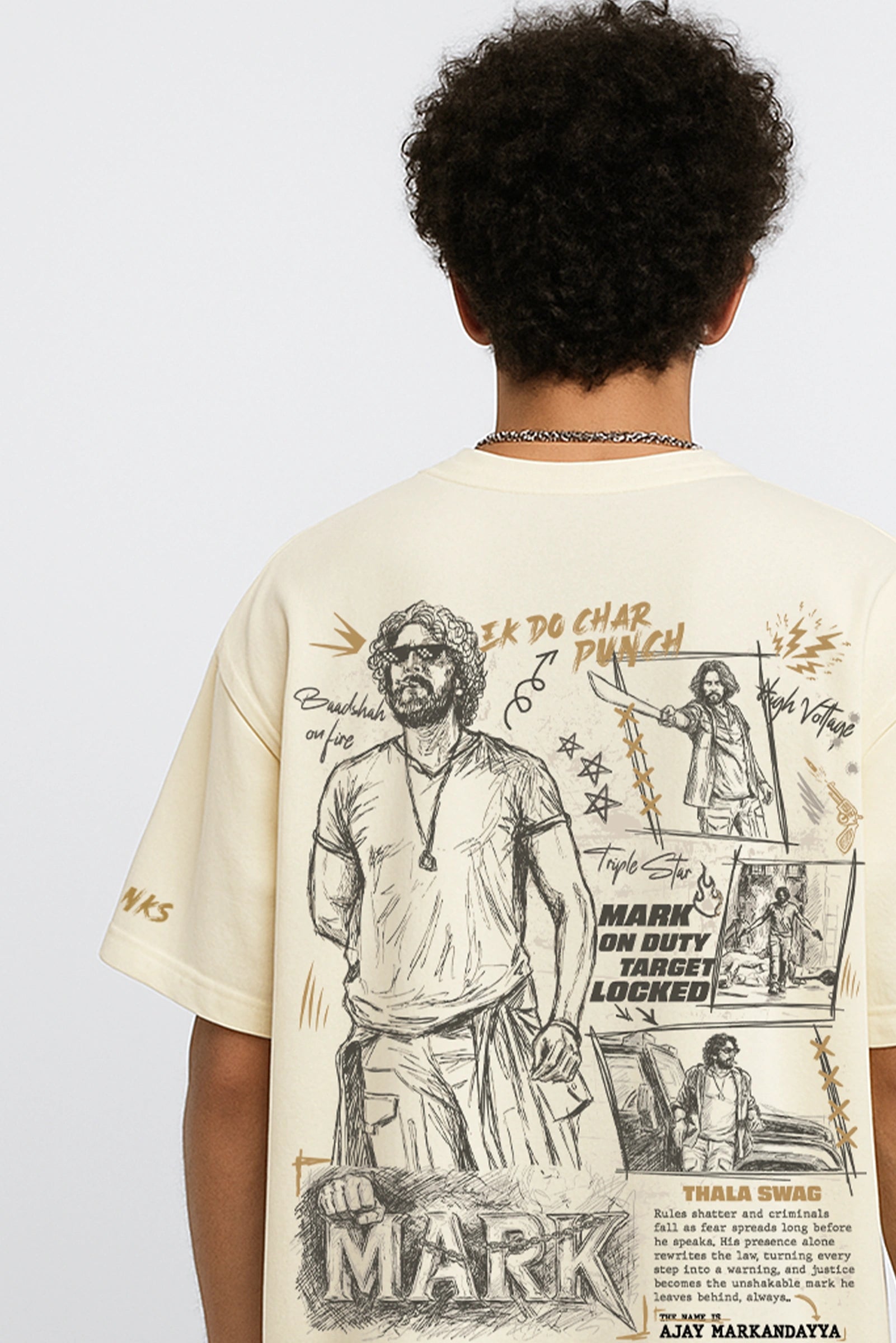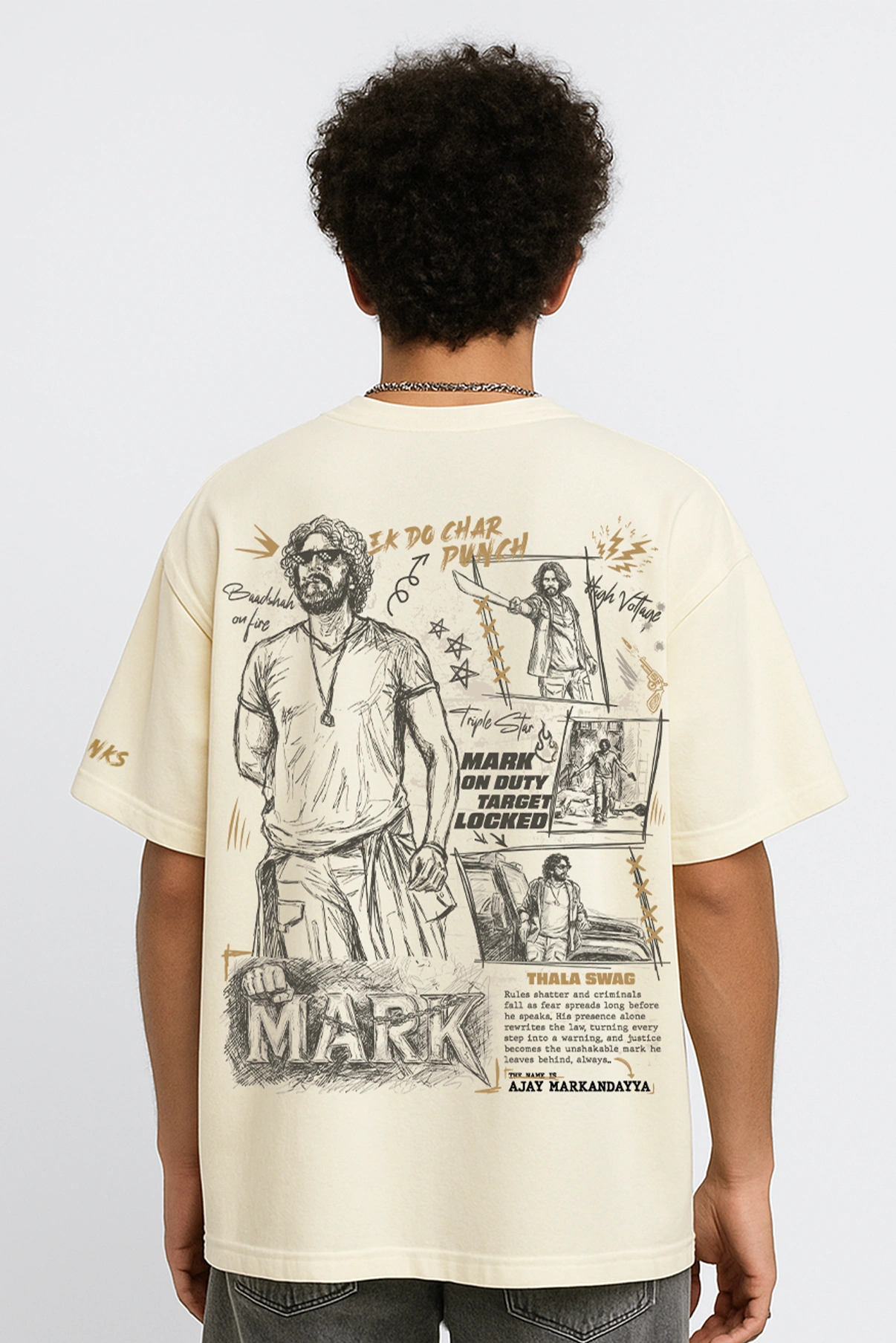 Shaped by resolve, driven by control. This oversized tee embodies the unstoppable presence of Ajay Markandeya in MARK — a powerful streetwear statement for those who hold their line, lead with force, and carry authority effortlessly.