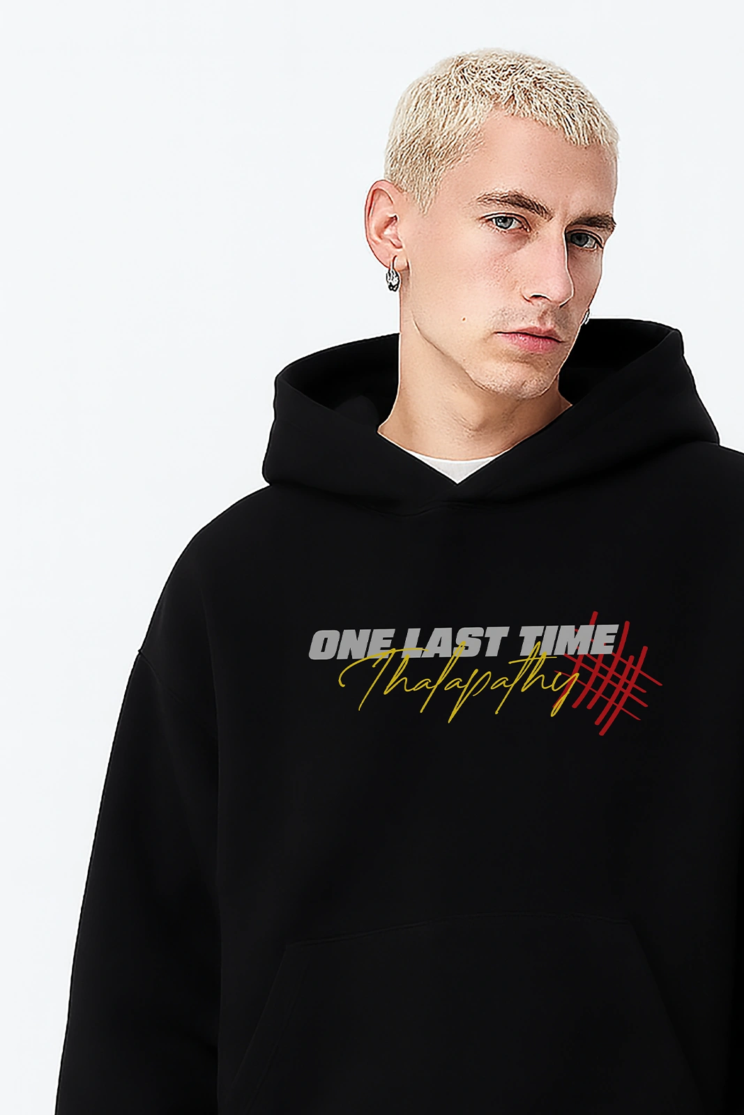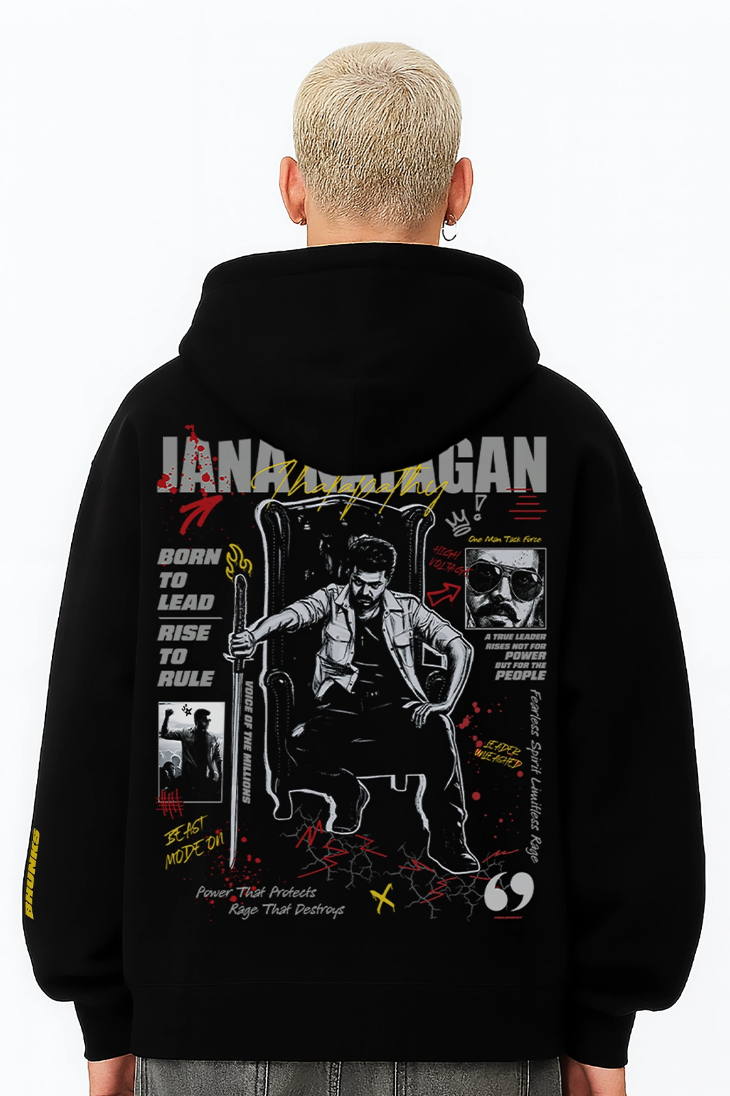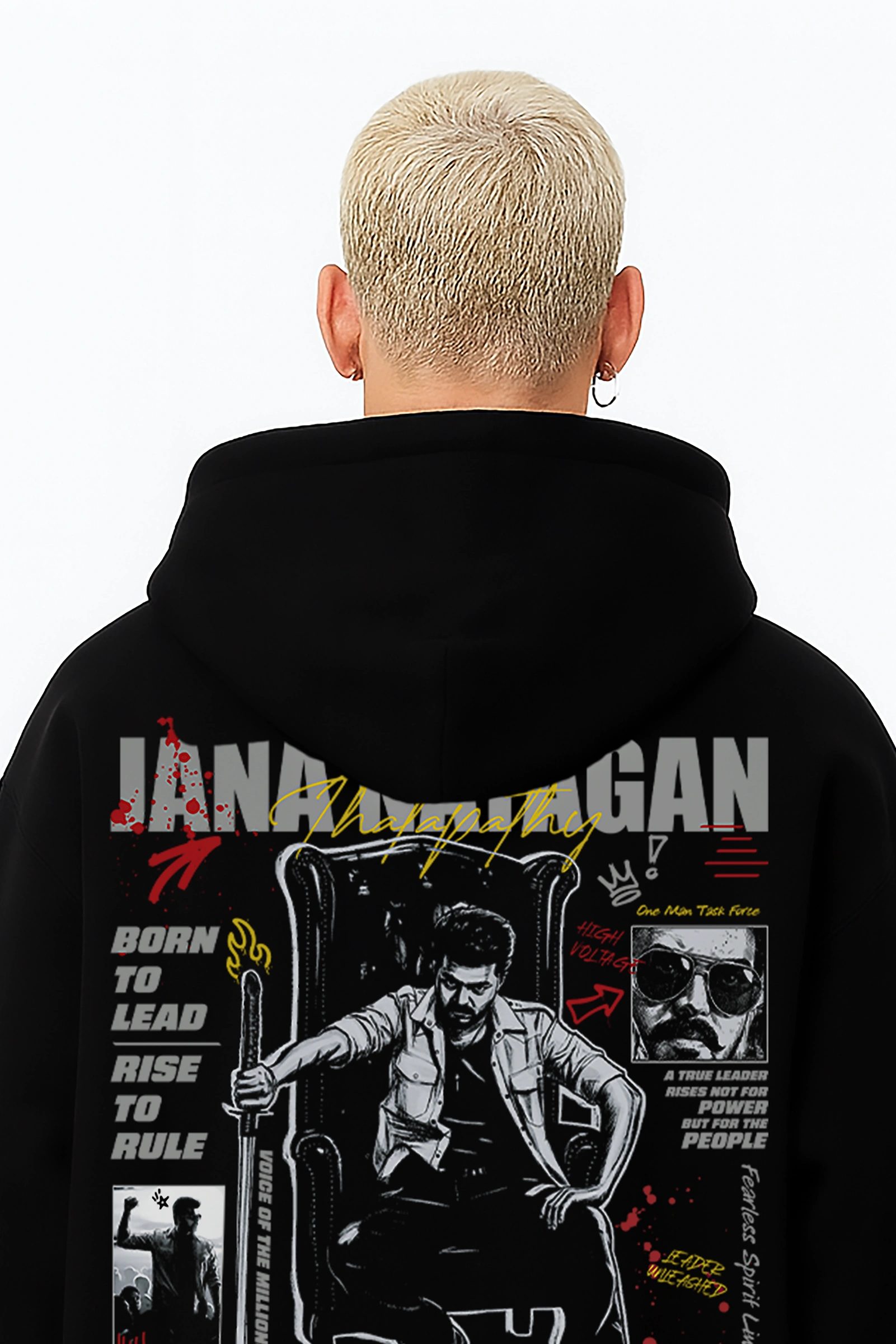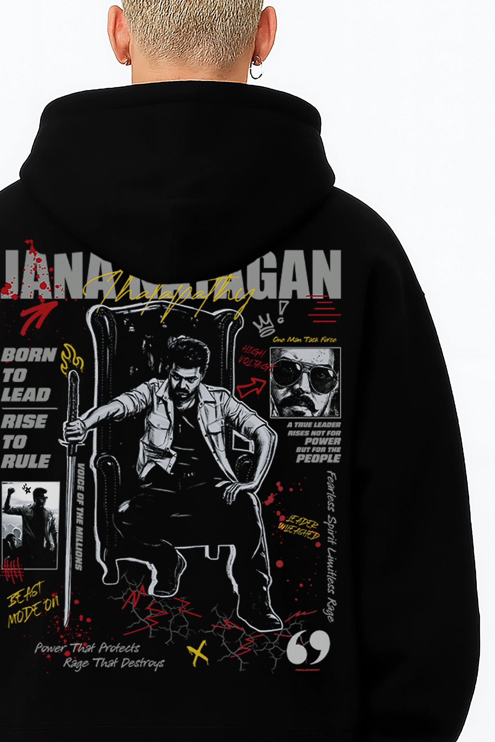 Bold, fearless, and built for leaders — this oversized hoodie reflects Thalapathy Vijay’s commanding presence in Jana Nayagan. Rise, make your mark, and wear your heroism loud and proud.
