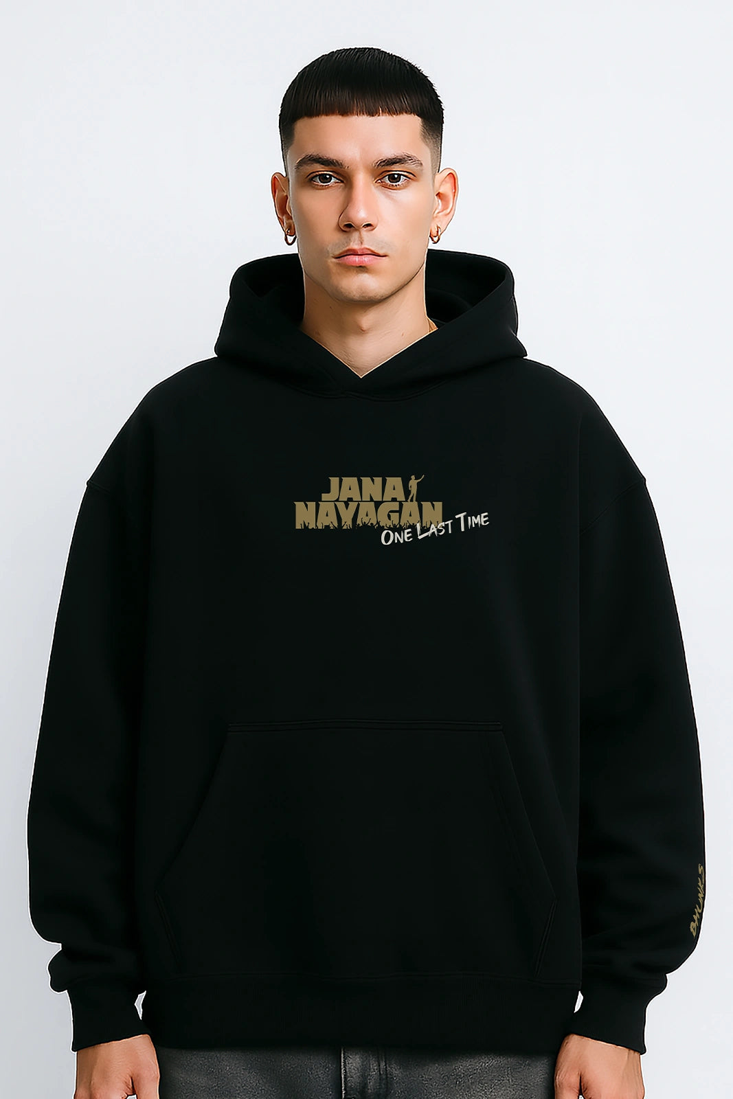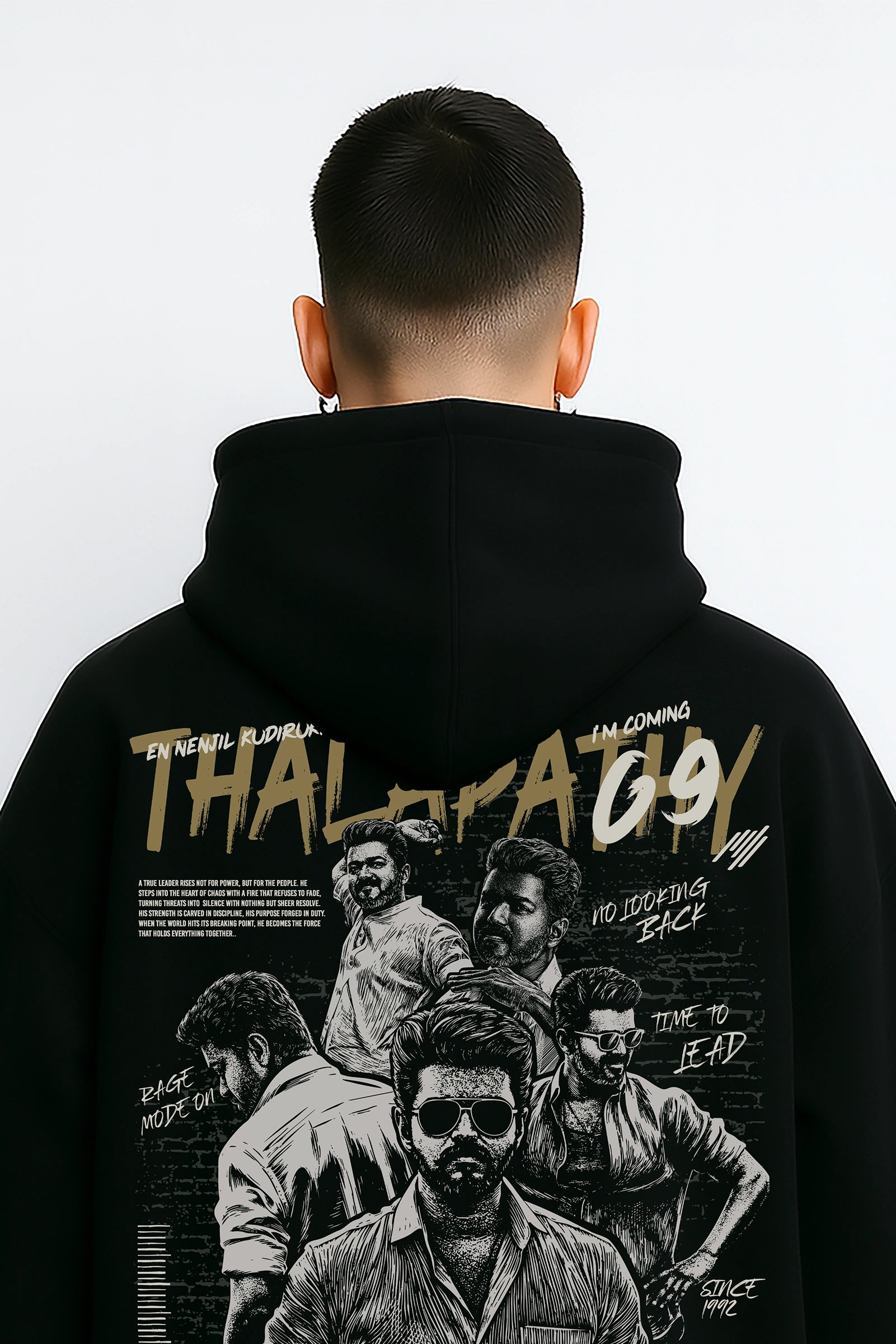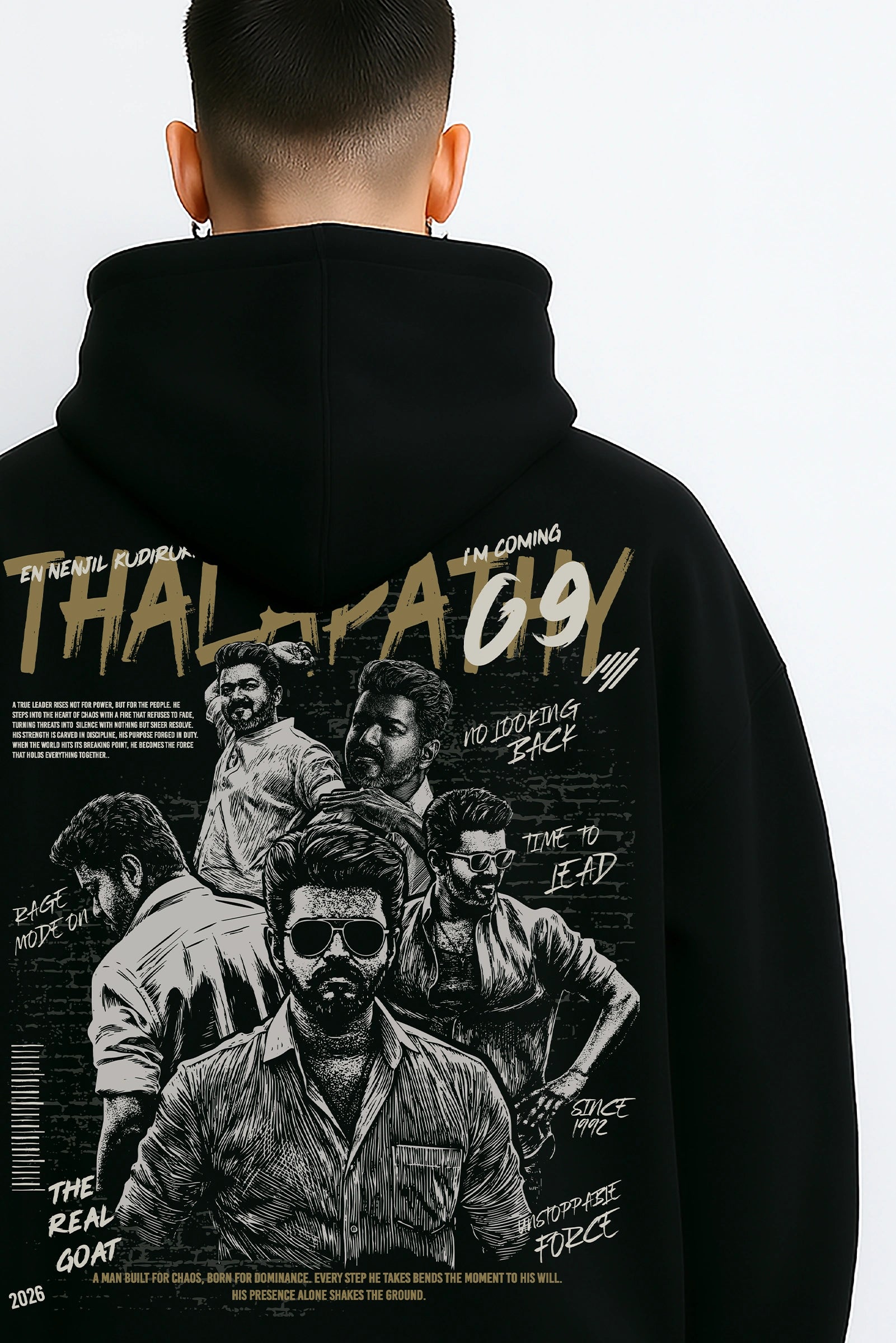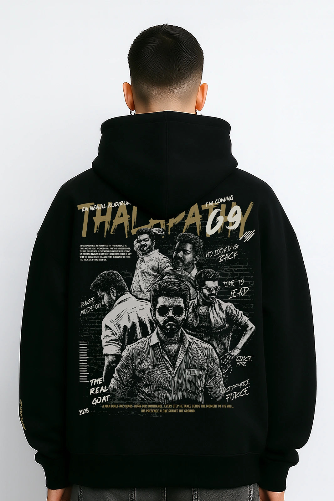 Forged with courage, leadership, and unstoppable energy — this oversized hoodie channels Thalapathy Vijay’s aura in Jana Nayagan. Designed for those who rise, make every moment count, and wear their heroism boldly.