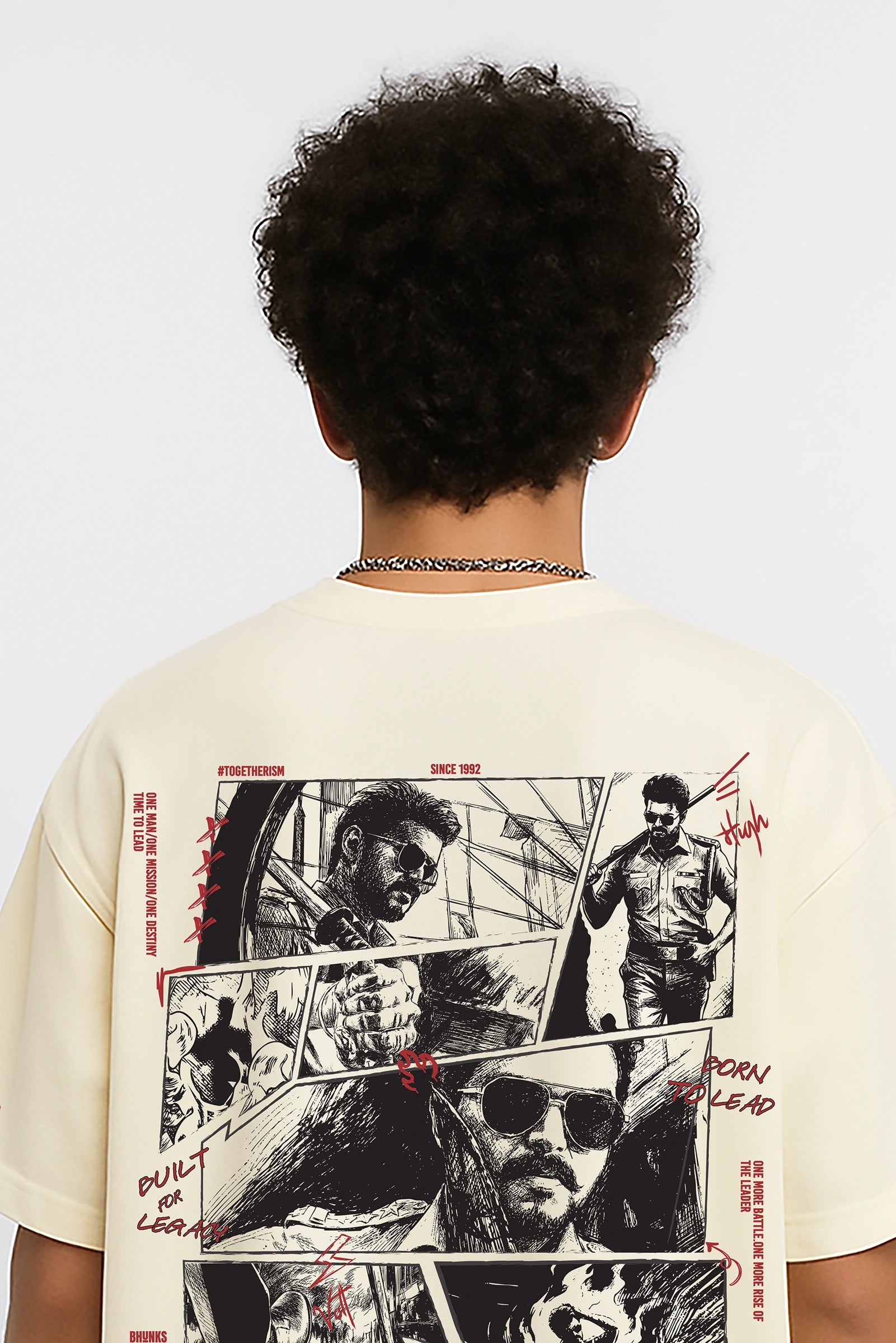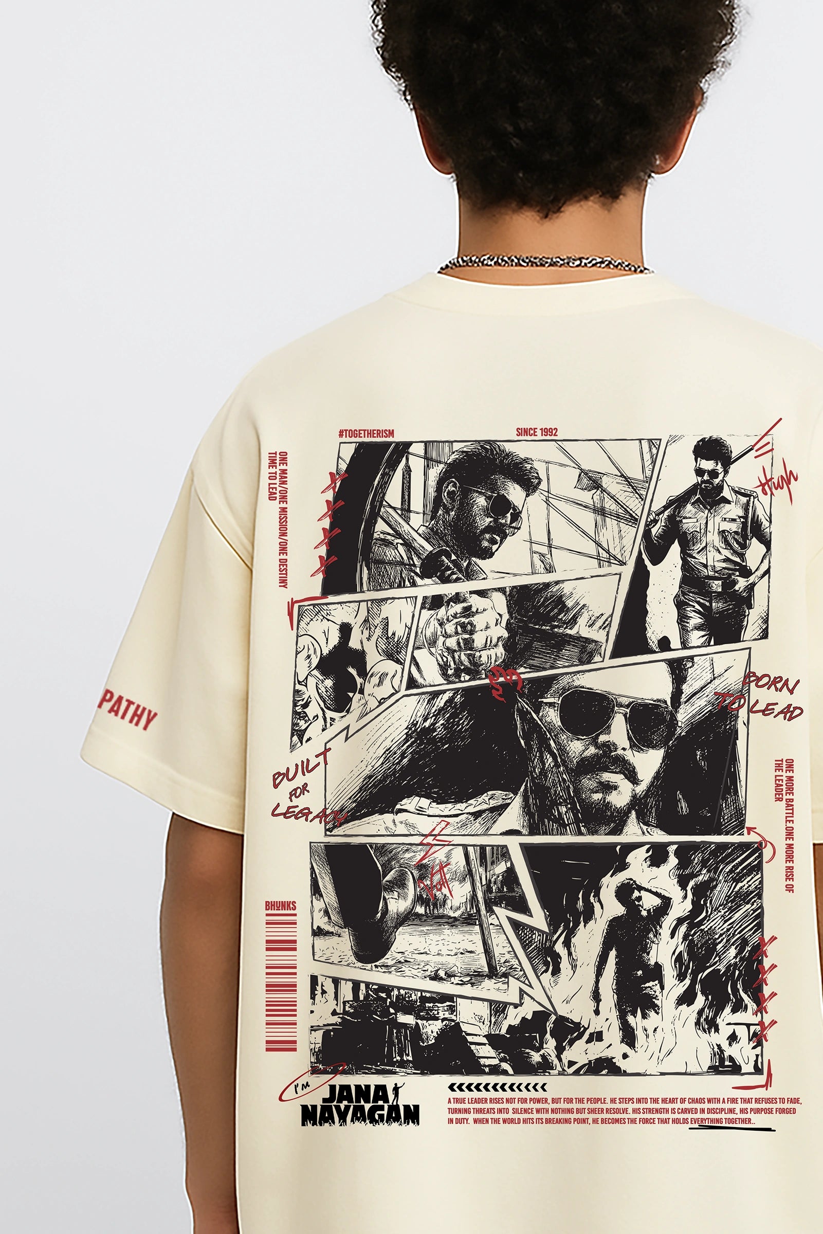 Forged in resolve, driven by leadership. This oversized tee channels the fearless, ready-to-strike aura of Thalapathy Vijay in Jana Nayagan — a commanding streetwear statement for those who rise with purpose, lead from the front, and wear power as their identity.