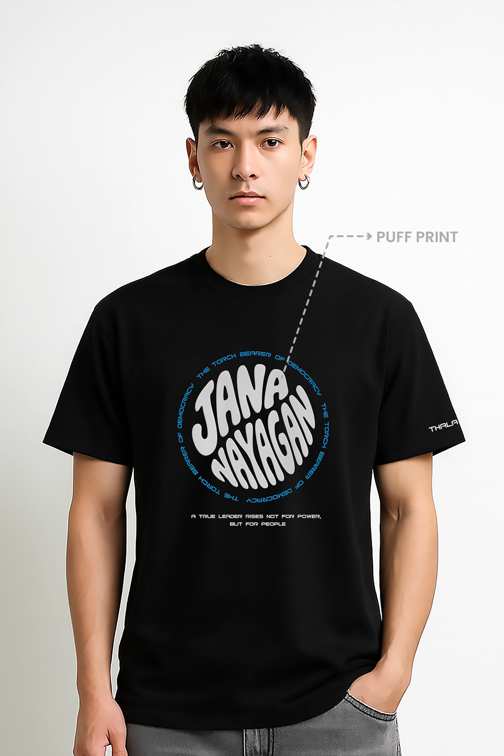 Leadership is in every step. This regular-fit tee channels Thalapathy Vijay’s commanding presence in Jana Nayagan — confident, composed, and built for true leaders.
